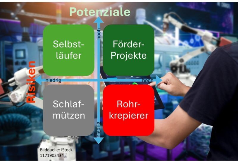 Die erfolgversprechendsten Projekte für eine Förderung sind die Projekte, die zwar keine Selbstläufer darstellen, aber über ein sehr hohes Erfolgspotenzial verfügen. Das wichtigste Kriterium hier ist, wie das jeweilige Projekt dazu beiträgt, die Zukunft des Unternehmens zu sichern. Dabei muss es sich nicht nur um finanzielle Kenngrößen handeln; wichtige Punkte sind zunehmend auch Unabhängigkeit von bestimmten Ressourcen oder Zuwachs an Know-how im Unternehmen. Wichtig: Fördermittel-Blindheit vermeiden, d.h., zuerst kommen Strategie und interessante Projekte und dann die Fördermöglichkeiten, nicht umgekehrt.